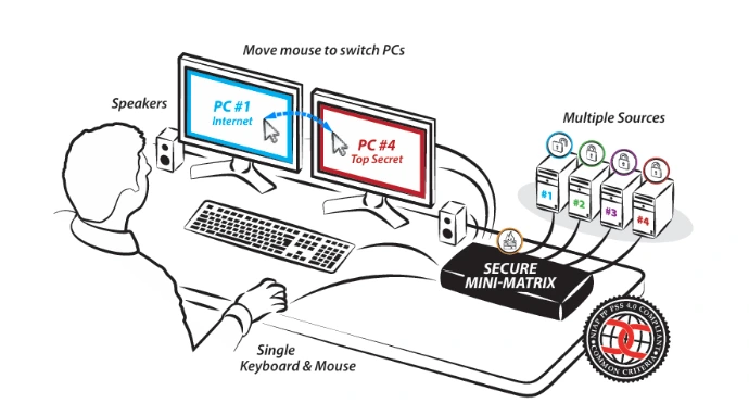 La mini matrice de HSL permet d’afficher et de contrôler simultanément plusieurs systèmes opérationnels tout en garantissant une séparation stricte entre les différents environnements, conforme aux exigences NIAP PP4.0. Elle assure une gestion fluide des sources grâce au basculement par simple déplacement de la souris et offre une exploitation sécurisée en 4K pour les postes critiques, centres de commandement et environnements classifiés.